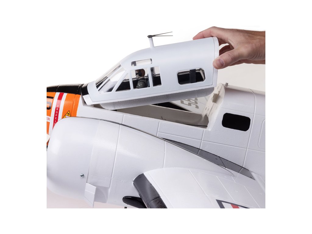 Lehký a odolný drak z kompozitního EPO materiálu je nabarven v dobře viditelné bílé barvě s oranžovými detaily, jedná se o originální vojenské zbarvení letounu amerického námořnictva, které nejprve vstoupilo do služby jako navigační cvičný letoun, poté prošlo generální opravou a v 50. letech 20. století bylo překonfigurováno na cvičné fotoprůzkumné letadlo. Opravdu velmi autentické zpracování je kromě původních proporcí také doplněno o tvarované linie panelů pláště, výfuky motorů, antény a průhlednou kabinu s figurkou pilota. Unikátní třídílná konstrukce křídla usnadňuje skladování, přepravu a přípravu modelu před letem, středová část obsahuje hlavní podvozek, konce křídel se jednoduše instalují a díky handsfree konstrukci se konektory sami připojí při nasazení křídla. Pro finální montáž není nutné žádné lepidlo, postačí běžné nářadí. Beechcraft D18/RC-45J 1.5m můžete mít připravený k letu za kratší dobu než jakékoliv jiné letadlo tohoto typu.