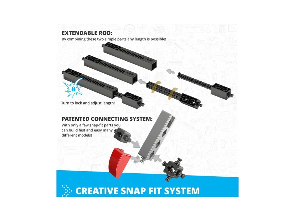 - Inovativní design: Patentovaná zaklapávací konektivita a vícesměrné otočné čepy umožňují stavět z různých úhlů až ze 6-ti stran současně.