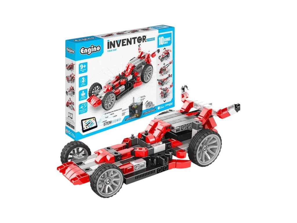 Stavebnice pro děti od 9 let, Engino Inventor Mechanics formule, sestavit lze 10 různých modelů aut, letadel, vrtulník, apod. Kreativní stavebnice s pohonnou jednotkou na baterie a sadou ozubených kol, s možností využít stávající díly k dalším stavebnicím Engino. Obrázkový přehledný barevný návod.