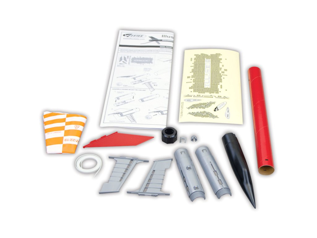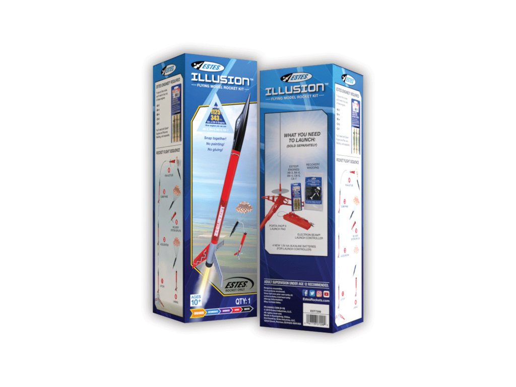 Model rakety Estes Illusion Kit je na raketové motory řady A - C. Stylová raketa s propracovanými stabilizátory a špicí po vzoru stíhacích letoun. Vhodná pro začátečníky, snadné sestavení. Létá do výšky až 343 m a k zemi se snese díky padáku o průměru 305 mm.