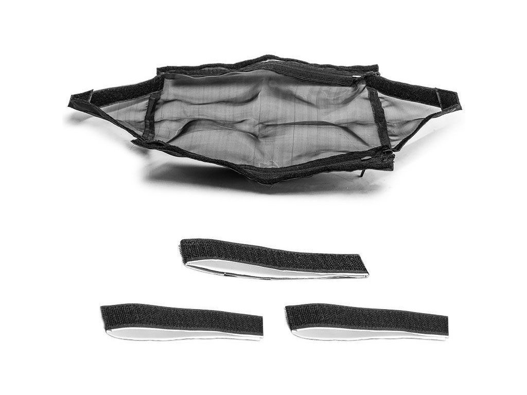 Nasaďte H-Speed protiprachový kryt seshora na podvozek a přehněte lemy na bok nebo pod šasí. Srovnejte a upravte polohu krytu a aplikujte přiloženou oboustrannou pásku suchého zipu přilepením na šasí. Pomocí zdrhovadla na obou stranách můžete protiprachový kryt odejmout.
