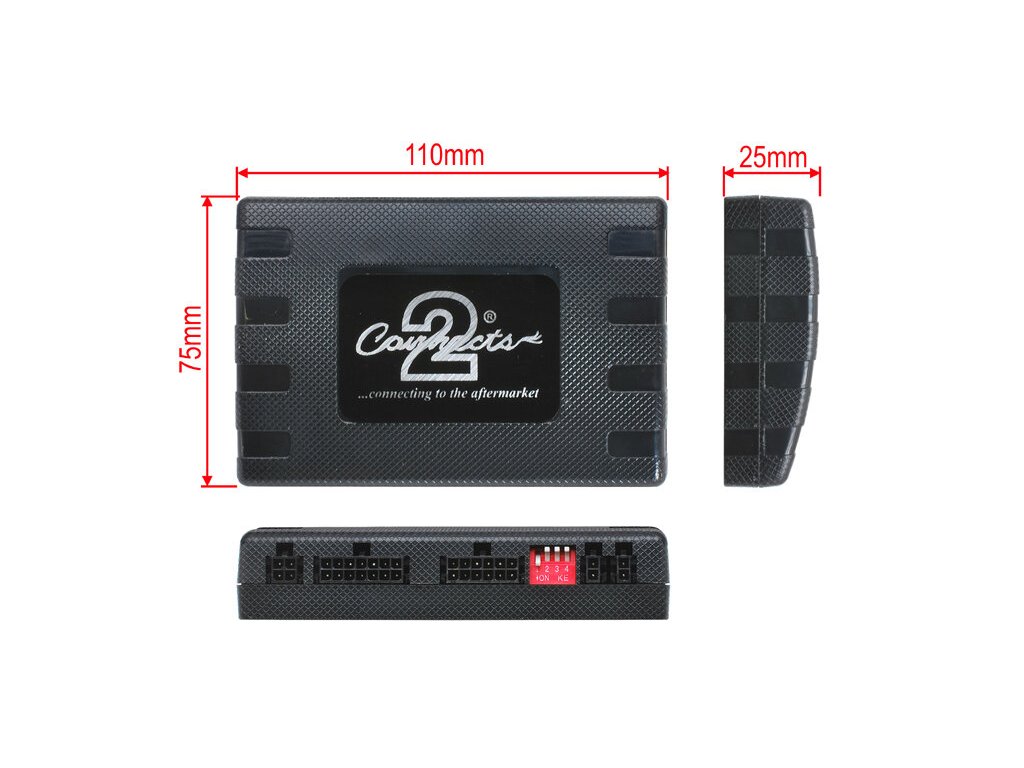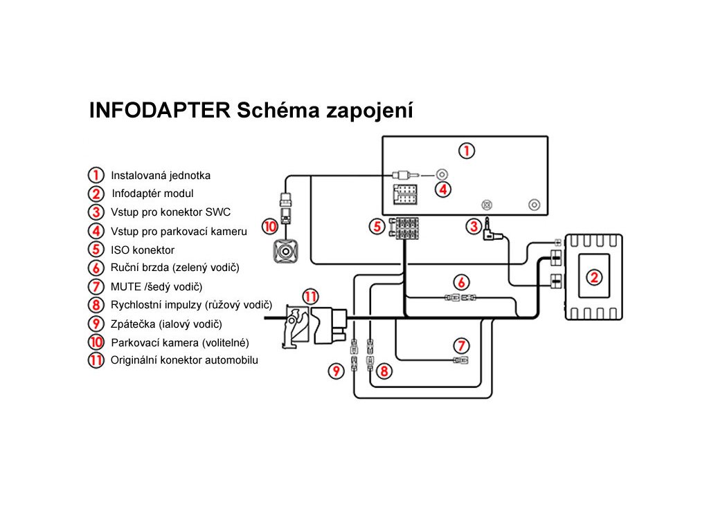 Informační adaptér pro zobrazení informací o vozidle na monitoru dodatečně instalované AV jednotky, ovládání na volantu a připojení parkovací kamery.