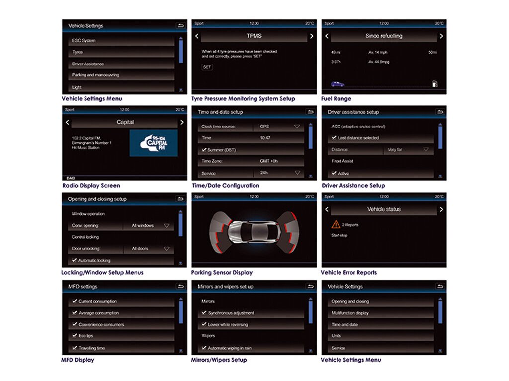 - zobrazení nastavení funkcí automobilu jako jsou: datum a čas, osvětlení, nastavení palubního pořítače - MFD, kontrola tlaku v pneumatikách ...)