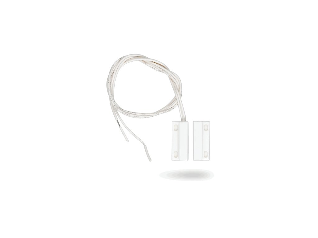 Magnetický dveřní kontakt (poplachový výstup pří rozpojení magnetů – NC rozpojeno). Rozměry 29x12x7 mm, pracovní vzdálenost max. 24mm.