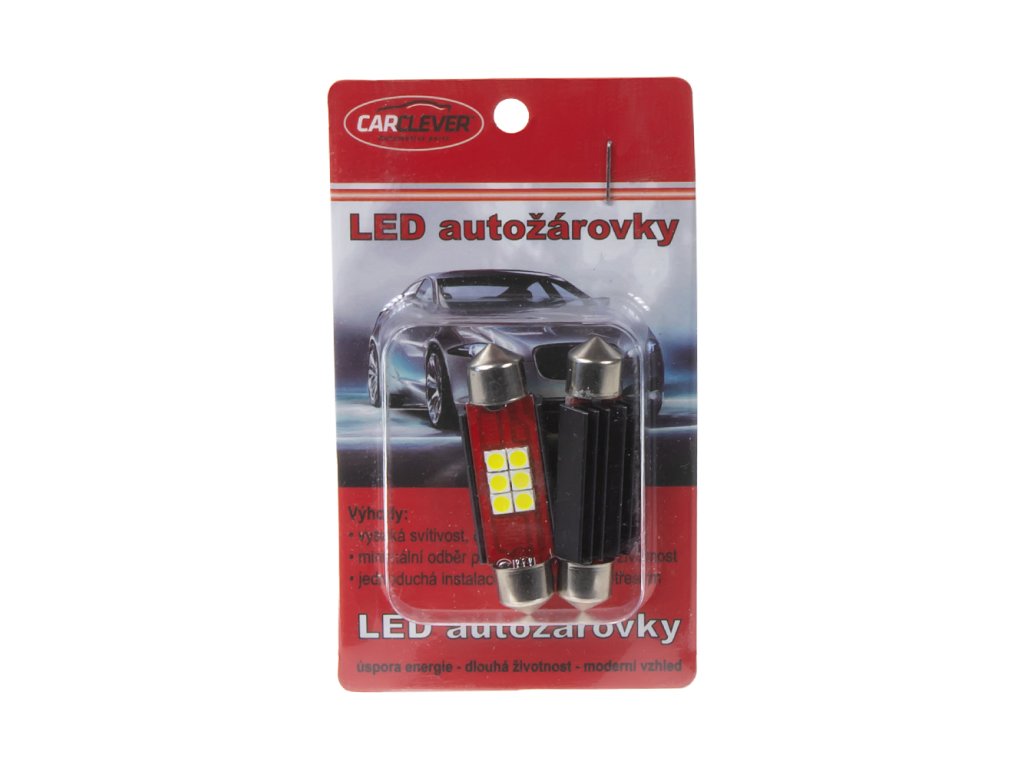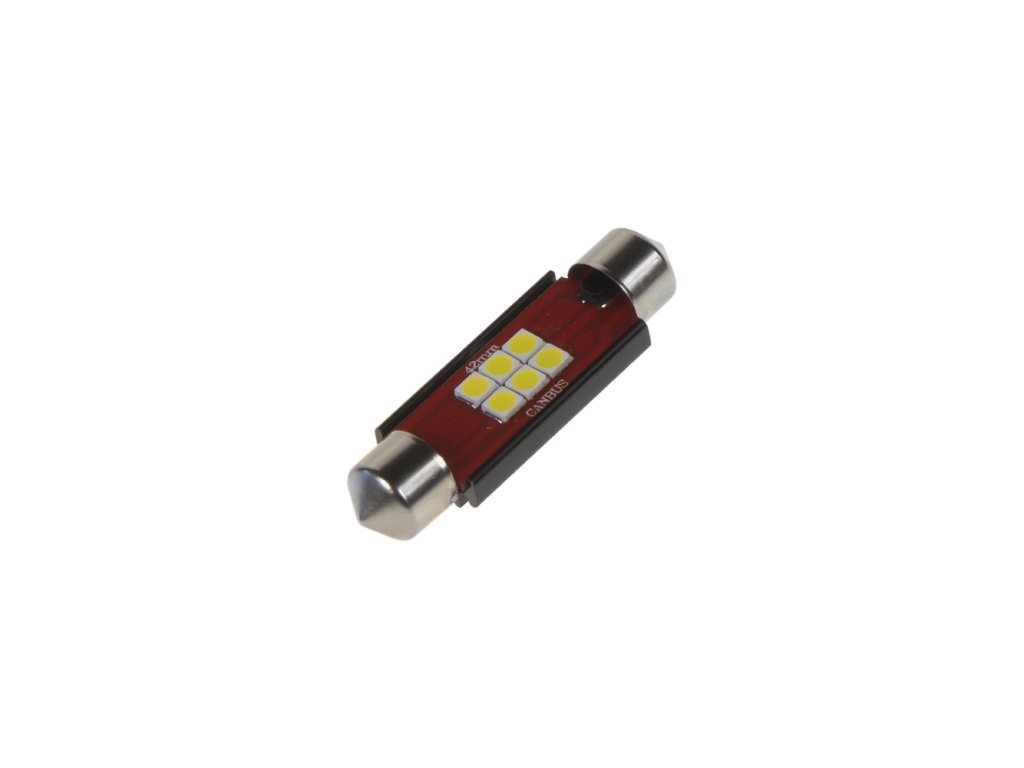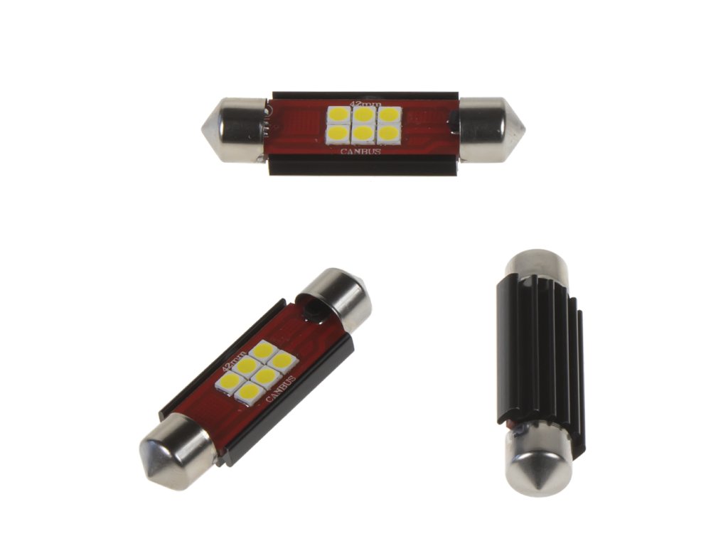 LED žárovka s paticí sufit (42 mm), bílá, s vestavěným rezistorem (nehlásí závady řídící jednotky na žárovce u nových vozidel) a chladičem, 6x vysocesvítivé SMD LED diody 2835SMD.