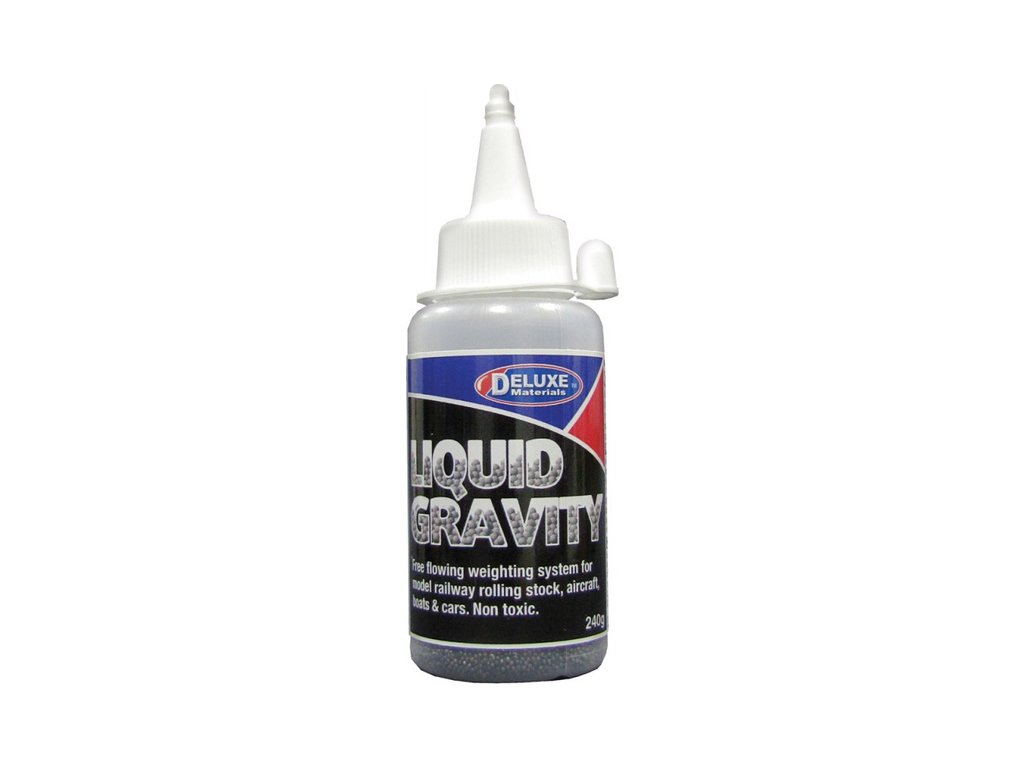 Liquid Gravity jsou kovové mikrogranule, kterými snadno a rychle vytvoříte zátěž nebo těžiště. Můžete je použít třeba v plastikových modelech jako využití zátěže v přídi modelu, aby se model nepřevracel (při modelech s příďovým podvozkem), nebo ve volných a rc modelech na tvorbu těžiště. Další využití je u modelové železnice, kde je také můžete uplatnit Liquid Gravity. Například v nákladních vagónech jako zátěž. Díky malé velikosti granulí můžete „tekutou gravitaci“ dostat do různých spár a otvorů. Aplikace se provádí nasypáním množství granulí do místa určení a prolití řídkým vteřinovým nebo epoxidovým lepidlem.