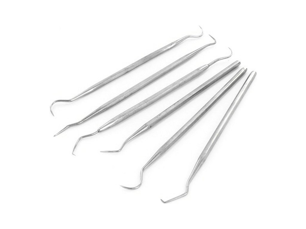 Sada 6-ti kusů mini háčků Modelcraft z nerezové oceli. Tyto ocelové nástroje umožňují přesné tvarování a rytí na modelech a různých předmětech. Celkem 12 koncovek usnadní práci modelářům a řemeslníkům při vyhlazování a nanášení měkkých materiálů a tmelů a rovněž pro seškrabování přebytečných částí.