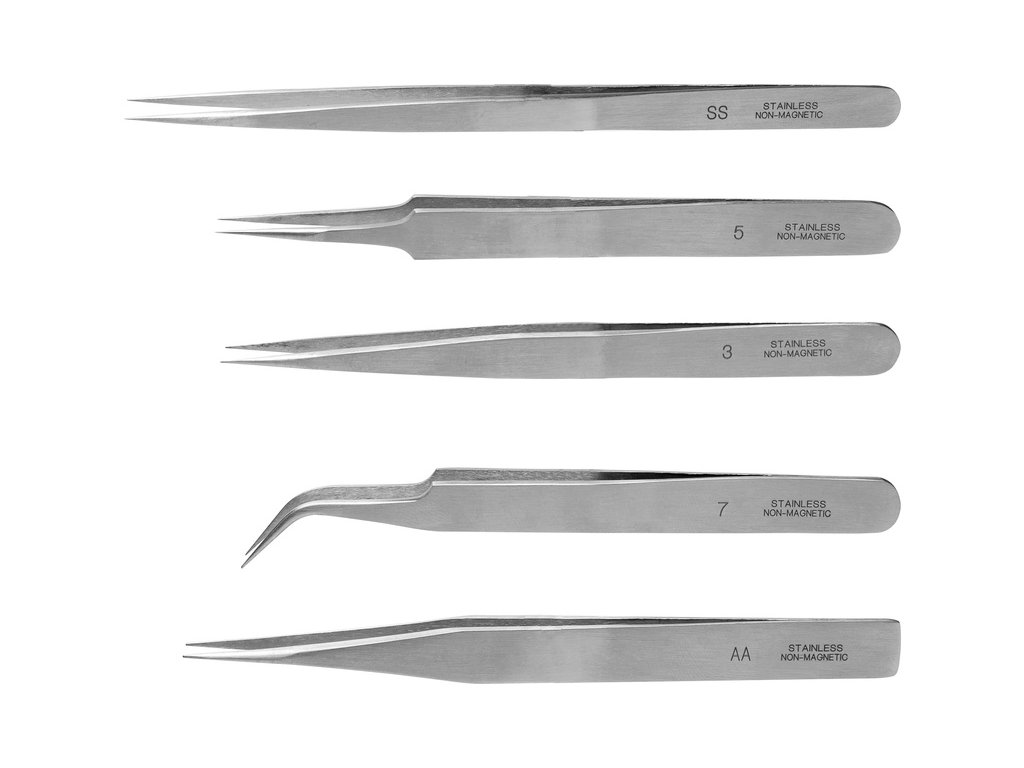 Modelcraft nerezové nemagnetické pinzety (sada 5ks) pro přesné a snadné chystání, držení a umístění malých dílů a součástí. Sada obsahuje pinzetu úzkou v různých délkách 4ks a zahnutou 1ks.