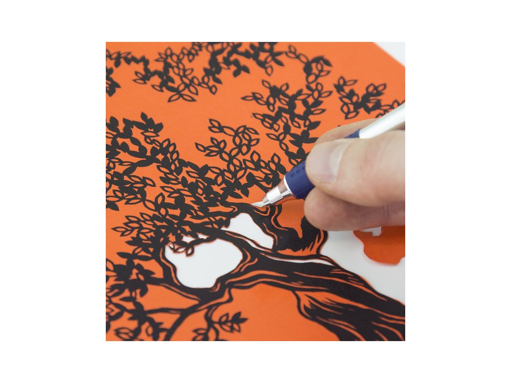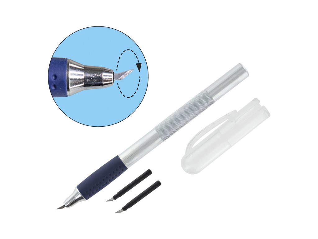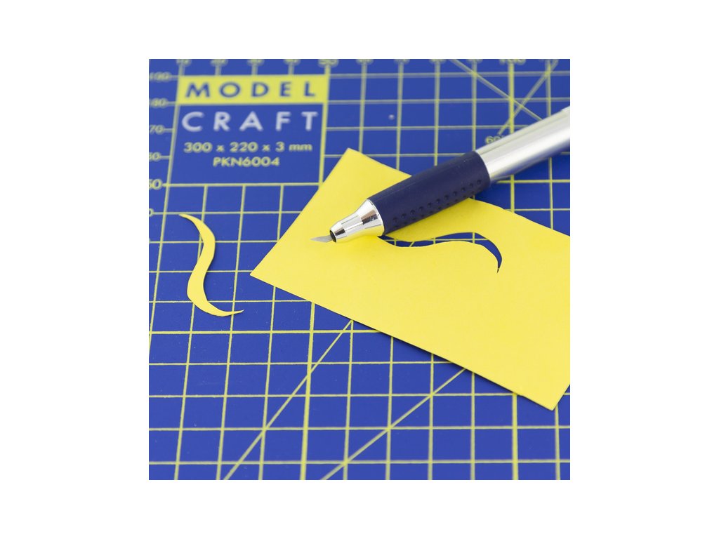 Modelcraft vyřezávací nůž s otočnou čepelí je speciální nástroj pro složité, detailní řezání křivek a tvarů v papíru, fóliích a plastu. Čepel se otáčí o 360 stupňů, rukojeť ve stylu pera s měkkou gumovou rukojetí pro pohodlné držení. Obsahuje bezpečnostní čepičku a dvě náhradní čepele.
