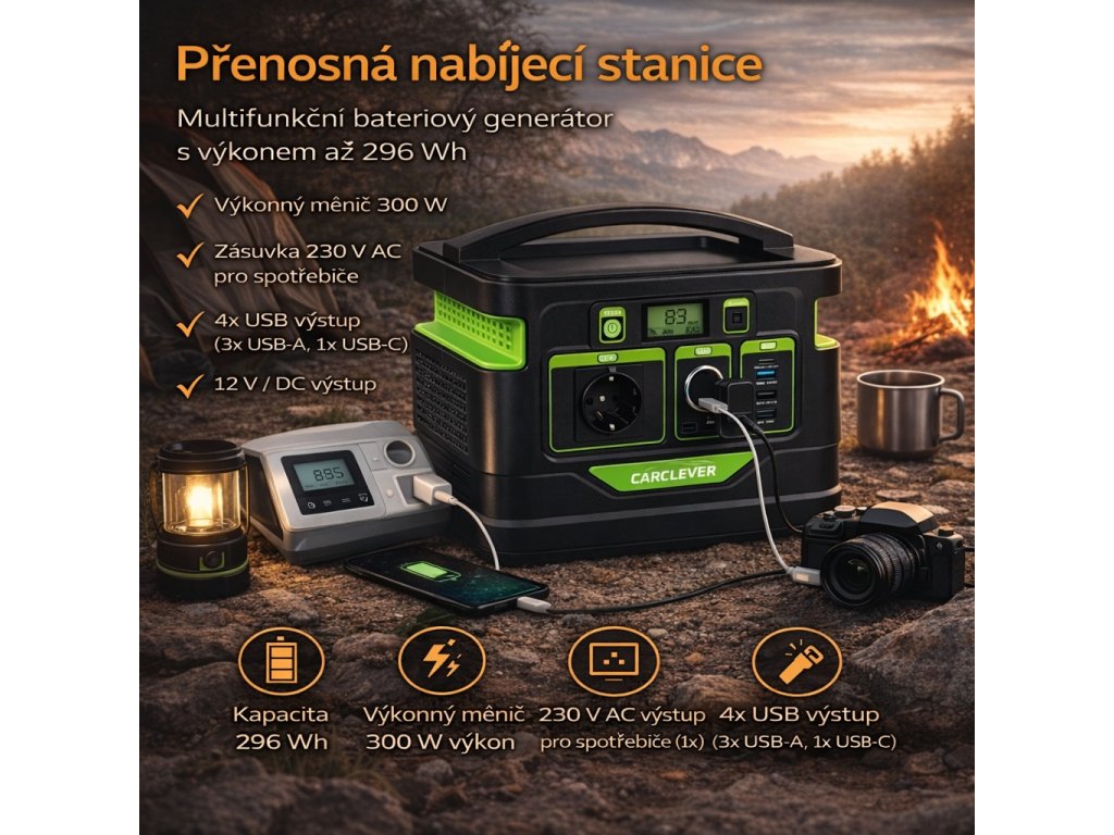 Nabíjecí stanice CARCLEVER - powerbanka, 296 Wh, AC-300W - GPS300