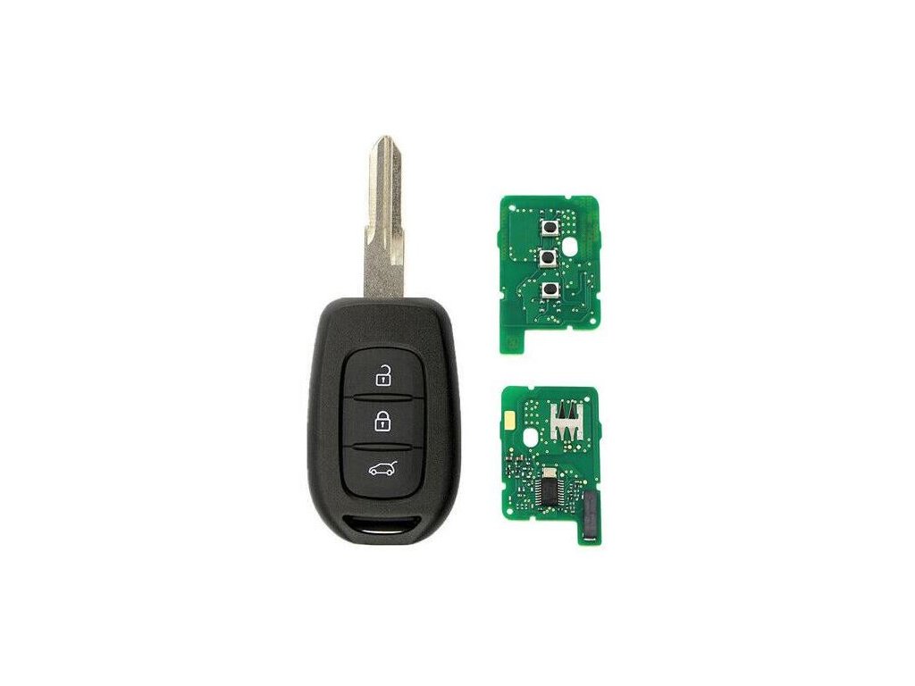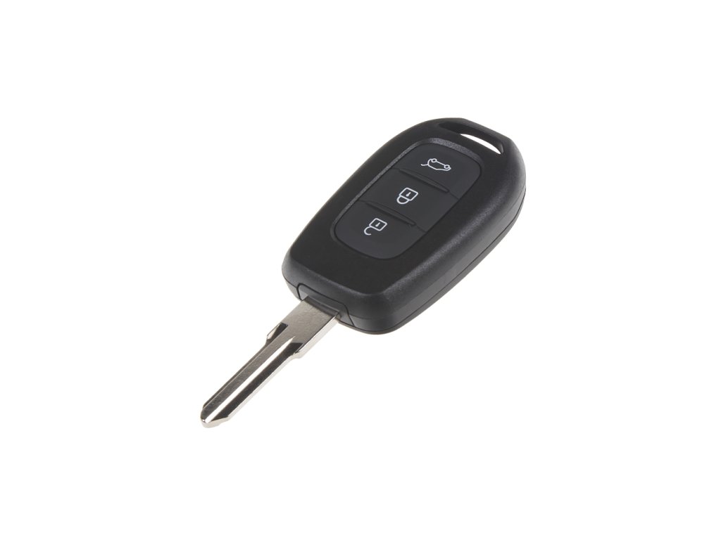 Náhradní klíč s dálkovým ovladačem pro vozy Dacia. Součástí klíče je planžeta klíče, dálkové ovládání centrálního zamykání se dvěmi tlačítky (čip PCF7961M).