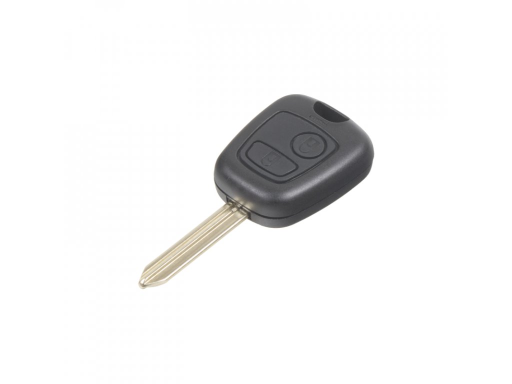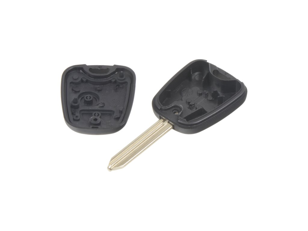 Náhradní obal vystřelovacího klíče pro vozy koncernu Peugeot s 2-tlačítkovým ovladačem (bez elektroniky a čipu imobilizéru). Planžeta klíče SX9, baterie je umístěna samostatně v obalu klíče. Do klíče je nutno vložit z původního klíče elektroniku dálkového ovládání a čip imobilizéru (transpondér), planžetu klíče je třeba nechat vyfrézovat podle tvaru originálního klíče.