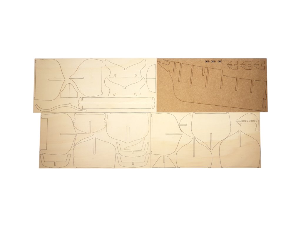 V balení jsou díly pro stavbu - laserem řezané díly, lišty, mosazné fotolepy, lanoví a další.
