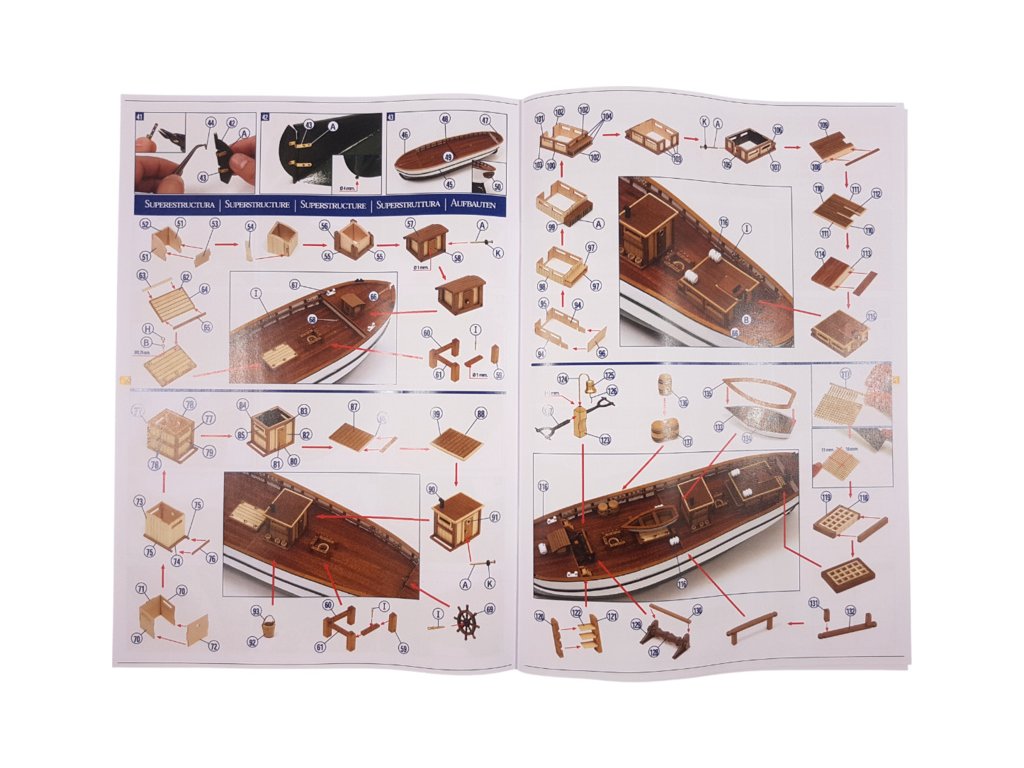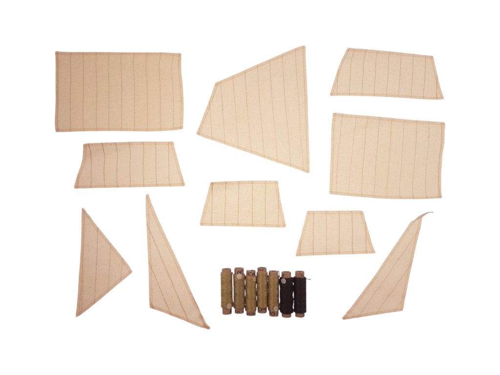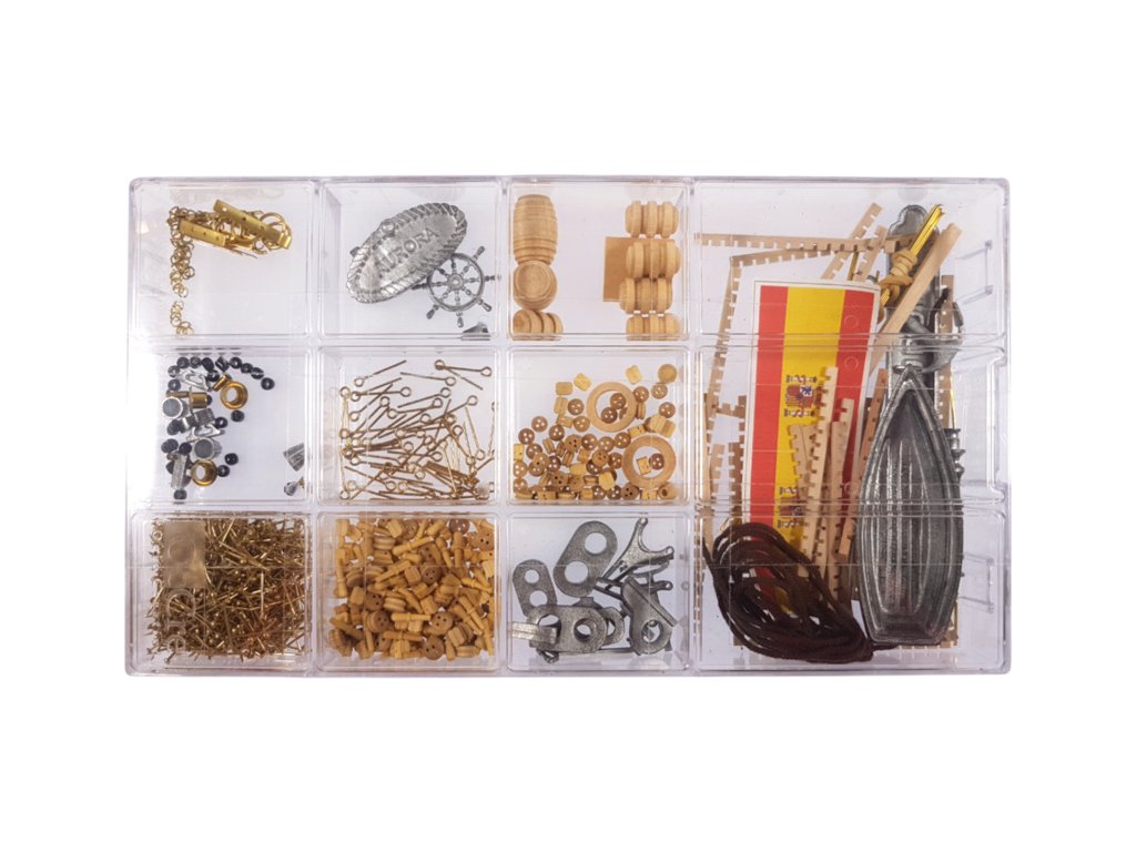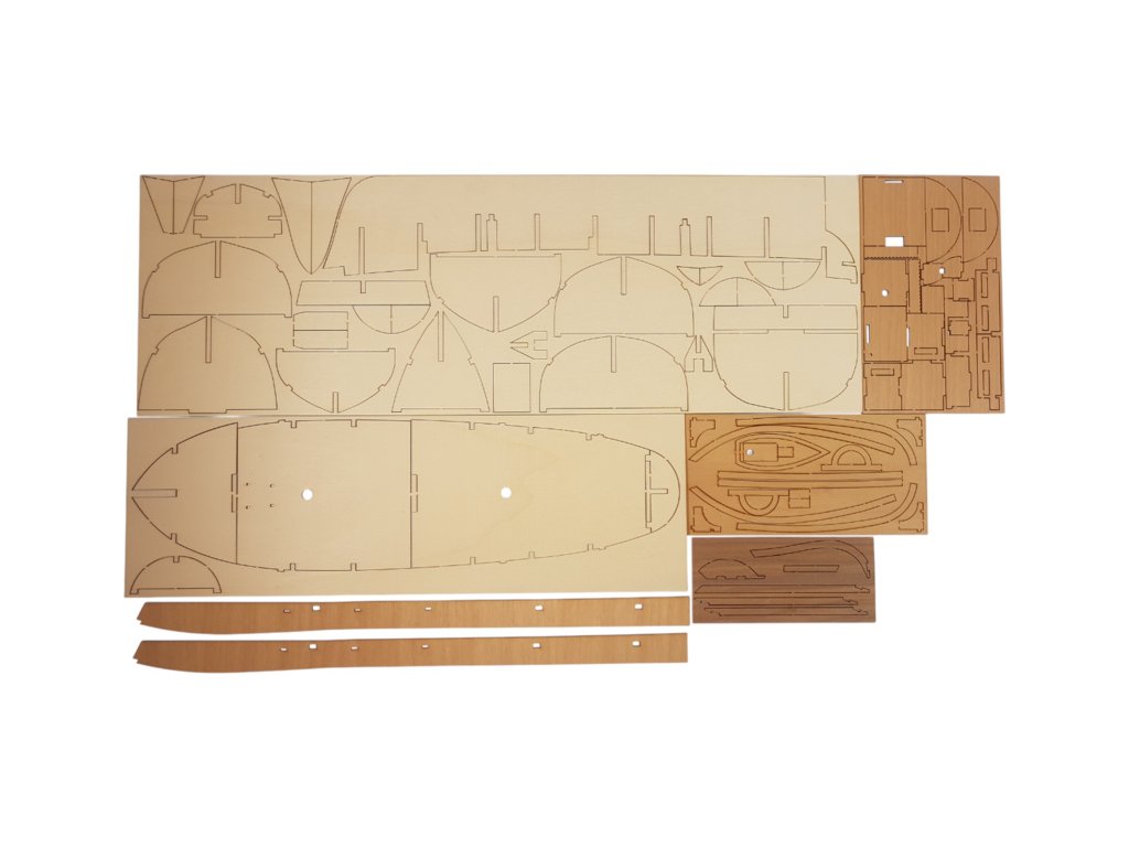 V balení jsou díly pro stavbu - laserem řezané díly, lišty, mosazné fotolepy, lanoví a další.