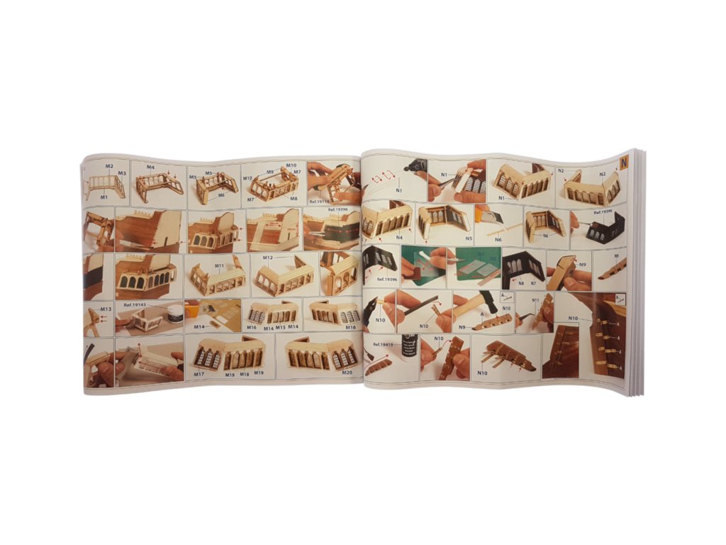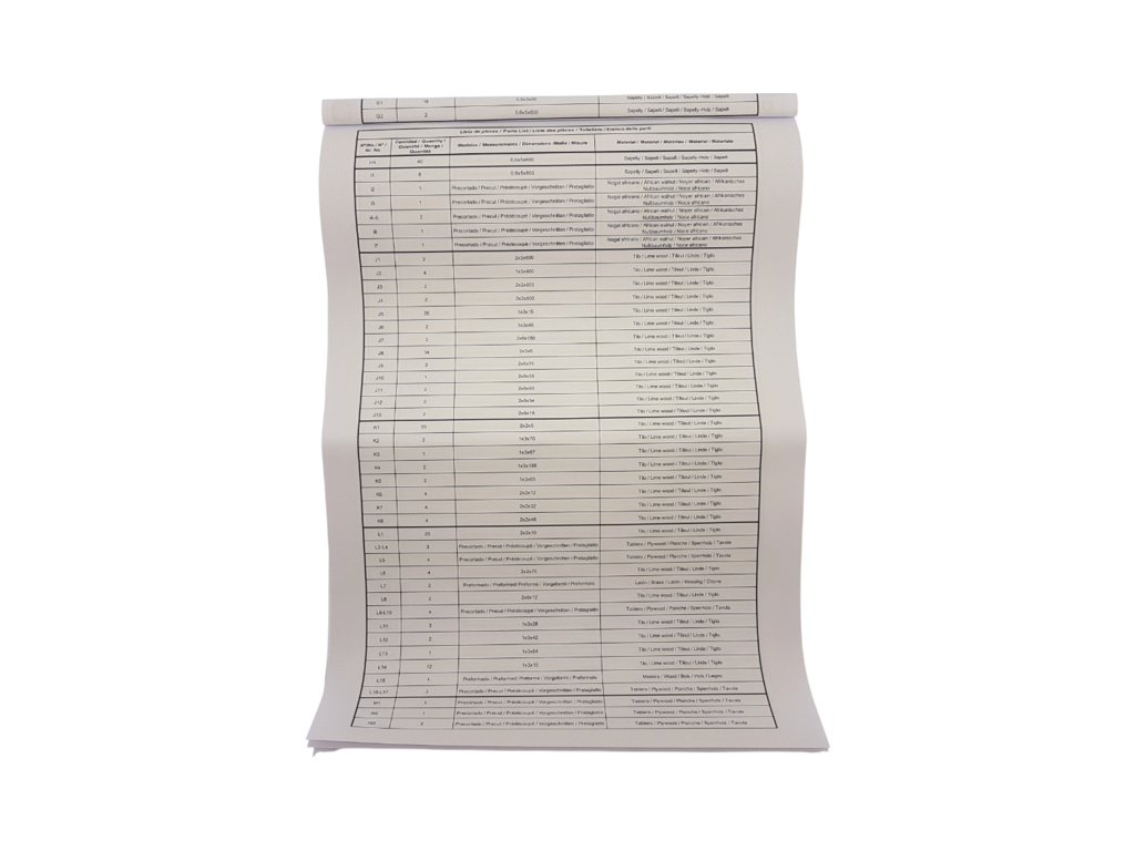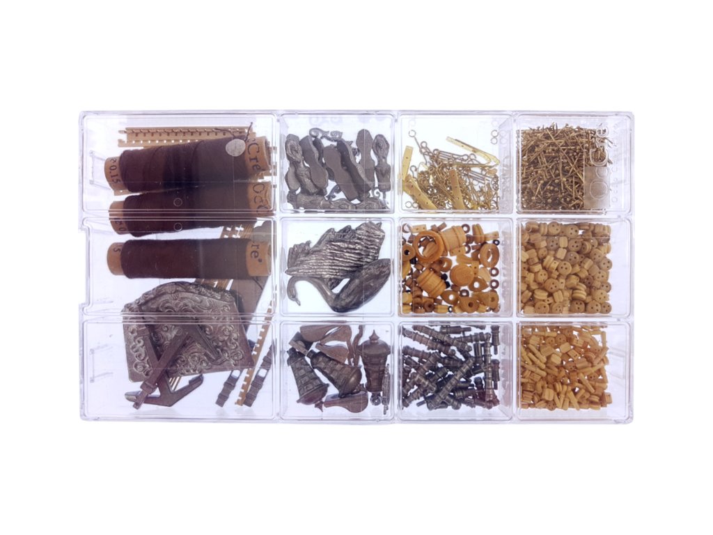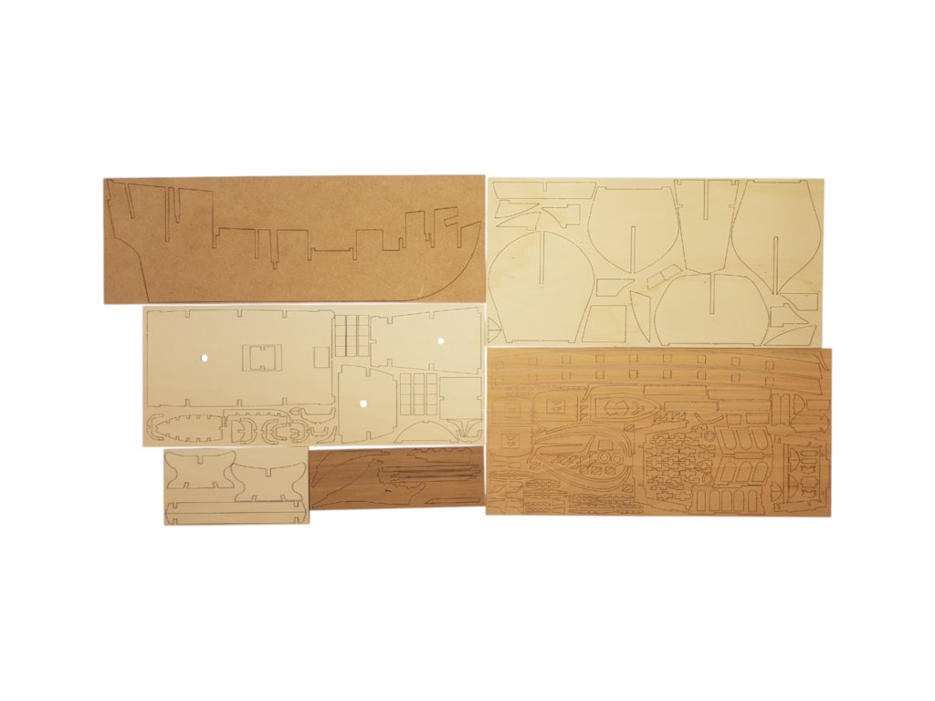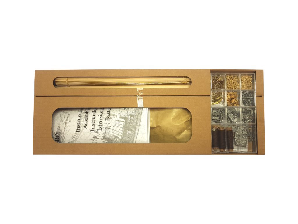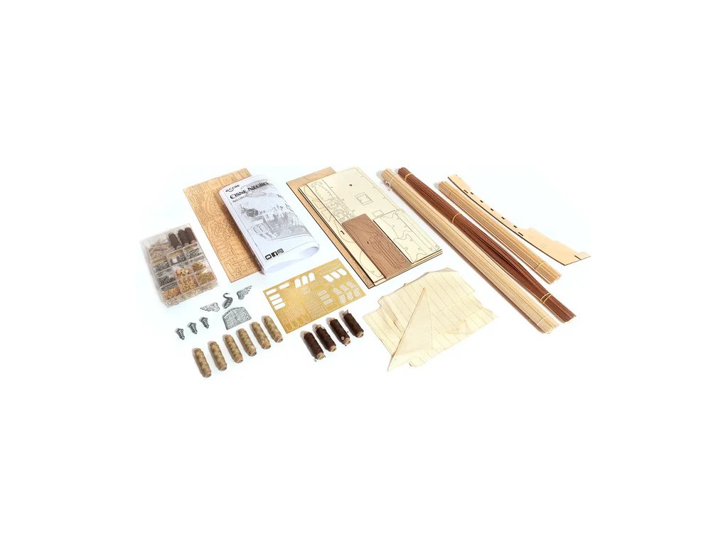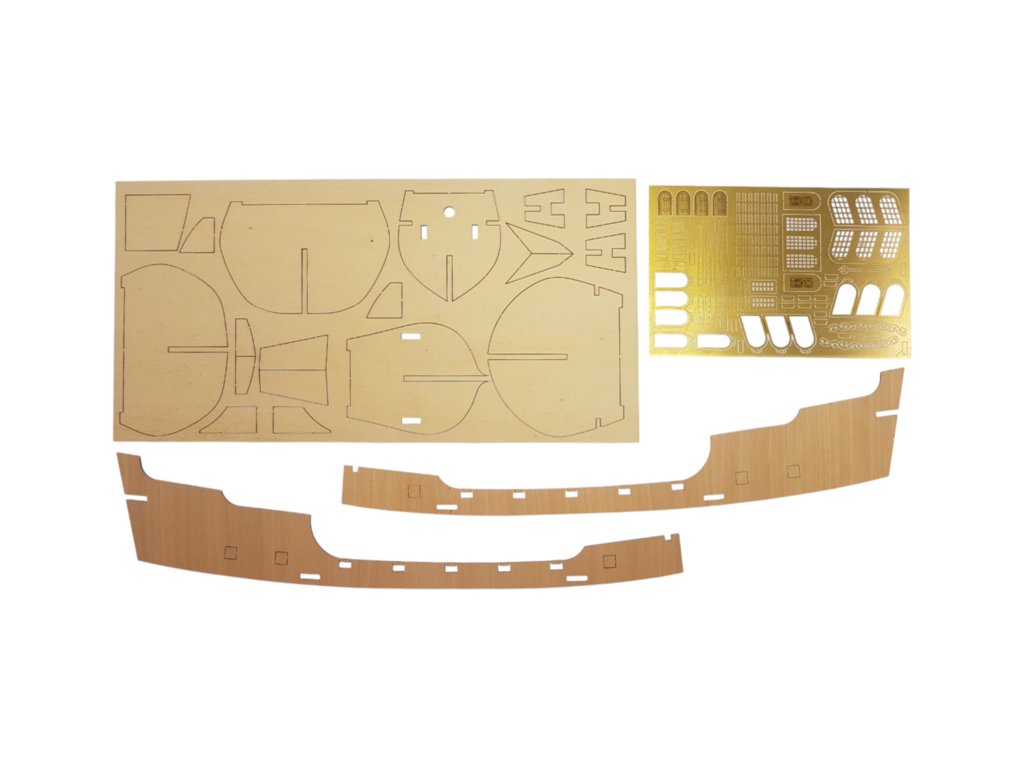 V balení jsou díly pro stavbu - laserem řezané díly, lišty, mosazné fotolepy, lanoví a další.