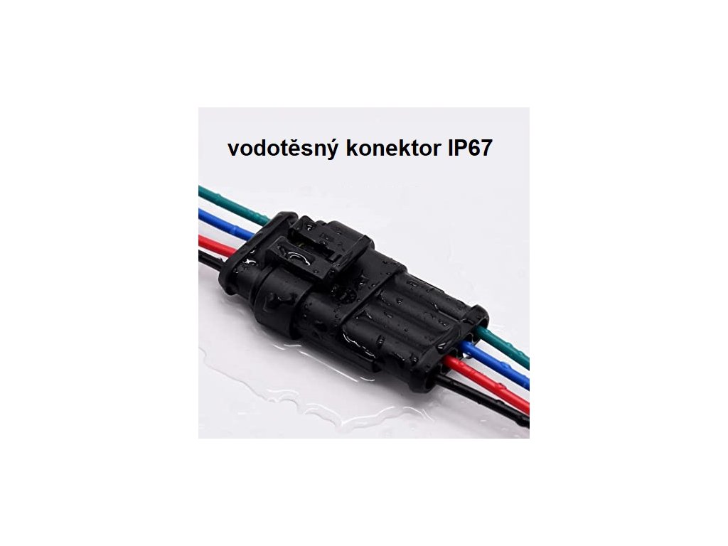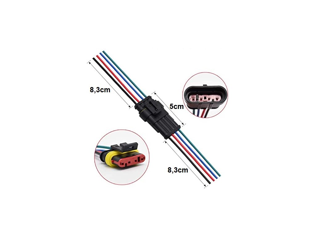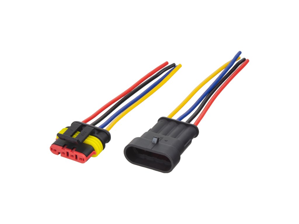 Vodotěsný konektor 4-vodičový. Zatížení konektoru 24V, 14A. Délka kabelů cm, balení 10 párů.