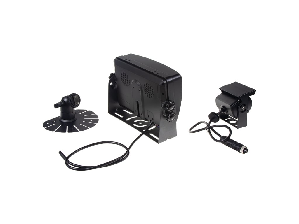 V balení je LCD 7" monitor + kamera + 15m propojovací kabel 4-PINový + dálkové ovládání + dvě provedení držáku monitoru.