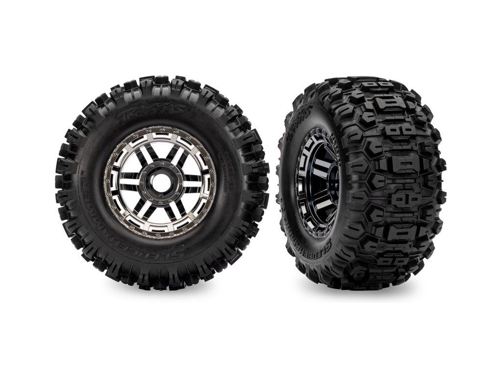 Traxxas kolo 2.8", disk černý chrom, Sledgehammer tires (2) - pneumatiky poskytují extrémní trakci a kontrolu nad modelem v různých off-roadových terénech. Nalepené pneumatiky s pěnovou vložkou na discích. Unášeč 17 mm.