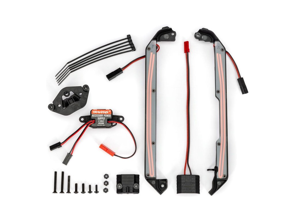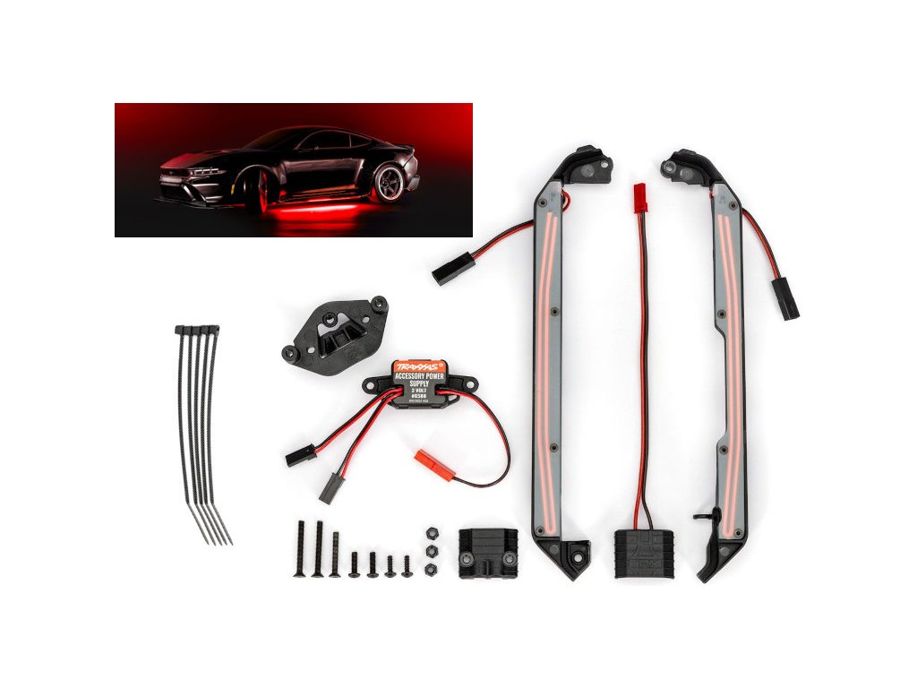 Traxxas LED podsvícení šasi červené dodá nezapomenutelný styl vašemu RC modelu Drift nebo jiným modelům s podvozek 4-Tec 2.0. Kompletní sada dvou prahových lišt s podsvícením, včetně napájecího zdroje, adaptéru konektoru a montážního příslušenství.