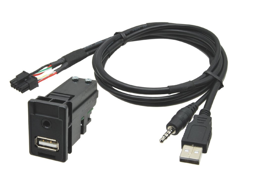 Adaptér pro připojení USB a AUX signálu, nahrazuje původní konektor v automobilu při použití aftermarket (dodatečně) instalovaného autorádia s výstupem USB + 4-pólový CINCH konektor.